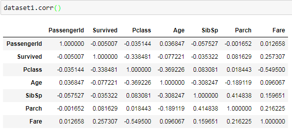 Function corr() will give you a table of values that tells us how correlated these features are. This table will be only for the numerical features.The more closer to 1 the value is, the more correlated they are and the more near to -1 the values are the more inversely correlated the fields are. If the value is near 0, the features are independent of each other.