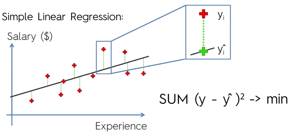 As you can see, y(i) is the real value and hat(y(i)) is the value that the model suggests. The green dotted line is the error. To get the best line, the least square error is selected considering all the green dotted lines. So basically, from a number of lines, the best line is selected and that line might change on adding new data to training dataset.