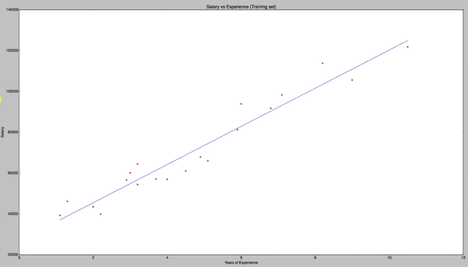 Scatter plot is a graph where there will be points for each and every entry and plot function is used to dwar a line on the graph. On plotting the training graph you will see a figure like this.